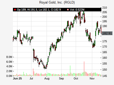 from Raymond James issued a price target of $257.00 for RGLD on 2025-10-21 15:43:11. The adjusted price target was set to $257.00. At the time of the announcement, RGLD was trading at $185.24. The overall price target consensus is at $245.00 with high price of $250.00, low price of $240.00, and median price is at $245.00. RGLD currently trades -11.52% versus its 52 week high of $209.42, and 129.67% compared to its 52 week low price of $129.67. Current 50 day moving average is $187.12, and the 200 day moving average is $167.45.