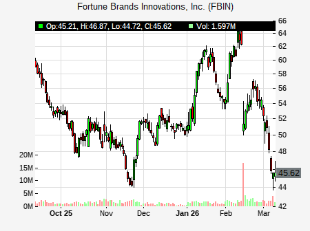 from BMO Capital issued a price target of $56.00 for FBIN on 2026-02-17 12:54:38. The adjusted price target was set to $56.00. At the time of the announcement, FBIN was trading at $51.32. The overall price target consensus is at $60.11 with high price of $70.00, low price of $52.00, and median price is at $60.00. FBIN currently trades -36.12% versus its 52 week high of $80.40, and 44.66% compared to its 52 week low price of $44.66. Current 50 day moving average is $50.36, and the 200 day moving average is $54.53.
