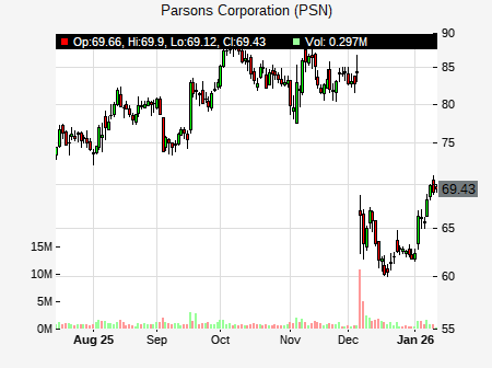 from KeyBanc issued a price target of $76.00 for PSN on 2026-01-07 11:50:32. The adjusted price target was set to $76.00. At the time of the announcement, PSN was trading at $65.89. The overall price target consensus is at $88.67 with high price of $107.00, low price of $70.00, and median price is at $90.00. PSN currently trades -35.16% versus its 52 week high of $101.92, and 54.76% compared to its 52 week low price of $54.76. Current 50 day moving average is $83.78, and the 200 day moving average is $72.59.