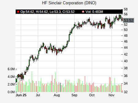 Manav Gupta from UBS issued a price target of $65.00 for DINO on 2025-11-04 12:37:45. The adjusted price target was set to $65.00. At the time of the announcement, DINO was trading at $53.39. The overall price target consensus is at $59.50 with high price of $66.00, low price of $43.00, and median price is at $61.50. DINO currently trades -4.03% versus its 52 week high of $55.63, and 24.72% compared to its 52 week low price of $24.72. Current 50 day moving average is $52.14, and the 200 day moving average is $40.31.
