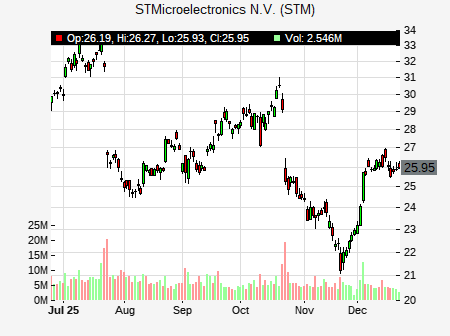 from Mizuho Securities issued a price target of $26.00 for STM on 2025-12-16 11:50:24. The adjusted price target was set to $26.00. At the time of the announcement, STM was trading at $26.47. The overall price target consensus is at $33.38 with high price of $45.00, low price of $22.00, and median price is at $33.25. STM currently trades -20.69% versus its 52 week high of $33.38, and 17.72% compared to its 52 week low price of $17.72. Current 50 day moving average is $26.14, and the 200 day moving average is $25.91.