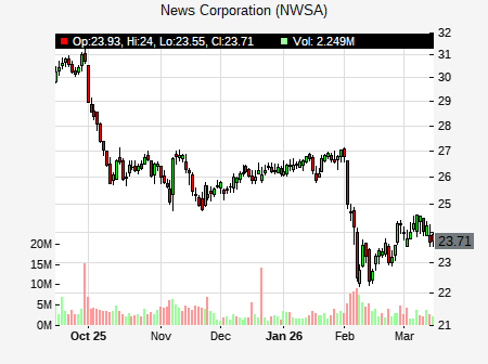 from Morgan Stanley issued a price target of $32.40 for NWSA on 2026-02-06 15:51:10. The adjusted price target was set to $32.40. At the time of the announcement, NWSA was trading at $23.1212. The overall price target consensus is at $33.33 with high price of $45.00, low price of $16.00, and median price is at $39.00. NWSA currently trades -26.85% versus its 52 week high of $31.61, and 23.70% compared to its 52 week low price of $23.70. Current 50 day moving average is $27.11, and the 200 day moving average is $27.94.
