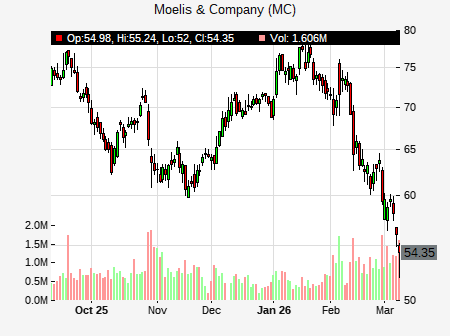 from UBS issued a price target of $70.00 for MC on 2025-12-11 10:54:48. The adjusted price target was set to $70.00. At the time of the announcement, MC was trading at $70.55. The overall price target consensus is at $77.00 with high price of $81.00, low price of $70.00, and median price is at $80.00. MC currently trades -11.42% versus its 52 week high of $79.61, and 46.57% compared to its 52 week low price of $46.57. Current 50 day moving average is $66.58, and the 200 day moving average is $63.33.