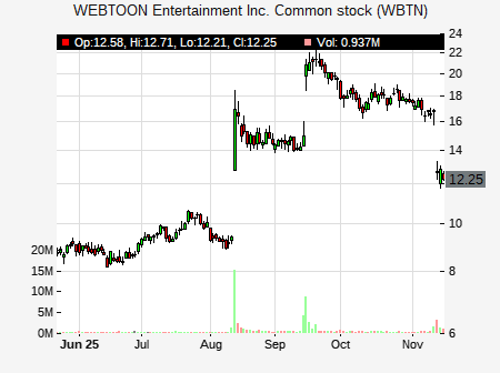 Jennifer Han from UBS issued a price target of $13.00 for WBTN on 2025-11-14 13:40:18. The adjusted price target was set to $13.00. At the time of the announcement, WBTN was trading at $12.46. The overall price target consensus is at $31.50 with high price of $62.00, low price of $11.00, and median price is at $26.50. WBTN currently trades -43.81% versus its 52 week high of $22.47, and 6.81% compared to its 52 week low price of $6.81. Current 50 day moving average is $17.68, and the 200 day moving average is $11.83.