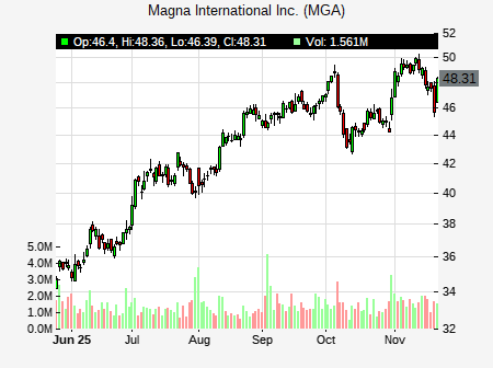 from Scotiabank issued a price target of $47.00 for MGA on 2025-10-17 14:08:04. The adjusted price target was set to $47.00. At the time of the announcement, MGA was trading at $44.65. The overall price target consensus is at $46.22 with high price of $52.00, low price of $38.00, and median price is at $47.00. MGA currently trades -10.32% versus its 52 week high of $49.80, and 29.97% compared to its 52 week low price of $29.97. Current 50 day moving average is $45.65, and the 200 day moving average is $39.11.