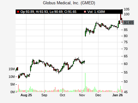 Matt O'Brien from Piper Sandler issued a price target of $115.00 for GMED on 2026-01-08 11:56:54. The adjusted price target was set to $115.00. At the time of the announcement, GMED was trading at $90.54. The overall price target consensus is at $89.67 with high price of $105.00, low price of $64.00, and median price is at $100.00. GMED currently trades -4.45% versus its 52 week high of $94.93, and 52.22% compared to its 52 week low price of $52.22. Current 50 day moving average is $66.01, and the 200 day moving average is $65.30.