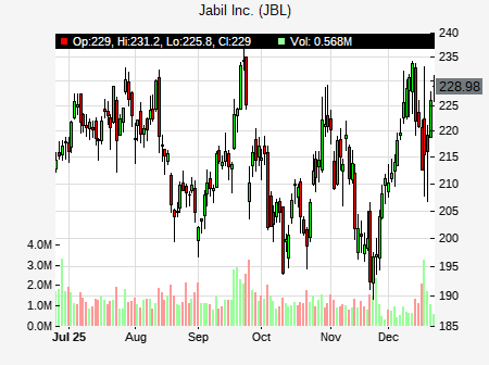 from Barclays issued a price target of $283.00 for JBL on 2025-12-18 10:47:41. The adjusted price target was set to $283.00. At the time of the announcement, JBL was trading at $216.1. The overall price target consensus is at $256.00 with high price of $267.00, low price of $241.00, and median price is at $260.00. JBL currently trades -9.14% versus its 52 week high of $237.05, and 112.80% compared to its 52 week low price of $112.80. Current 50 day moving average is $210.10, and the 200 day moving average is $186.57.