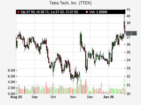 Andrew Wittmann from Robert W. Baird issued a price target of $43.00 for TTEK on 2026-01-29 12:53:17. The adjusted price target was set to $43.00. At the time of the announcement, TTEK was trading at $37.1. The overall price target consensus is at $48.00 with high price of $48.00, low price of $48.00, and median price is at $48.00. TTEK currently trades -14.48% versus its 52 week high of $43.27, and 27.69% compared to its 52 week low price of $27.69. Current 50 day moving average is $33.68, and the 200 day moving average is $33.65.
