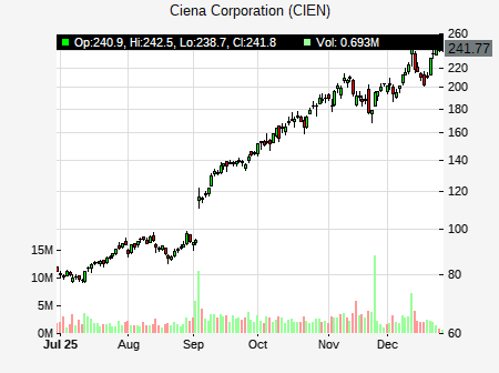 David Vogt from UBS issued a price target of $230.00 for CIEN on 2025-12-12 13:23:41. The adjusted price target was set to $230.00. At the time of the announcement, CIEN was trading at $225.65. The overall price target consensus is at $216.56 with high price of $279.00, low price of $120.00, and median price is at $240.00. CIEN currently trades 5.00% versus its 52 week high of $214.17, and 50.17% compared to its 52 week low price of $50.17. Current 50 day moving average is $171.30, and the 200 day moving average is $103.15.