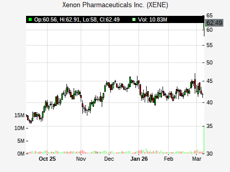 Paul Matteis from Stifel Nicolaus issued a price target of $89.00 for XENE on 2026-03-09 13:30:00. The adjusted price target was set to $89.00. At the time of the announcement, XENE was trading at $61.58. The overall price target consensus is at $56.60 with high price of $66.00, low price of $44.00, and median price is at $58.00. XENE currently trades 37.26% versus its 52 week high of $44.95, and 27.40% compared to its 52 week low price of $27.40. Current 50 day moving average is $40.26, and the 200 day moving average is $35.78.