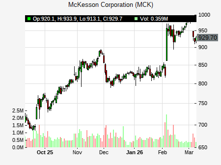 from Raymond James issued a price target of $970.00 for MCK on 2026-03-05 15:28:00. The adjusted price target was set to $970.00. At the time of the announcement, MCK was trading at $930.31. The overall price target consensus is at $967.33 with high price of $1,050.00, low price of $900.00, and median price is at $967.00. MCK currently trades 3.97% versus its 52 week high of $895.58, and 562.28% compared to its 52 week low price of $562.28. Current 50 day moving average is $799.56, and the 200 day moving average is $715.44.
