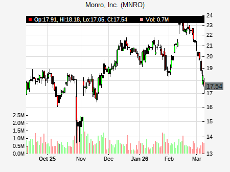 from Oppenheimer issued a price target of $40.00 for MNRO on 2026-02-11 09:51:18. The adjusted price target was set to $40.00. At the time of the announcement, MNRO was trading at $21.32. The overall price target consensus is at $18.00 with high price of $18.00, low price of $18.00, and median price is at $18.00. MNRO currently trades -21.17% versus its 52 week high of $27.07, and 12.02% compared to its 52 week low price of $12.02. Current 50 day moving average is $17.56, and the 200 day moving average is $15.87.