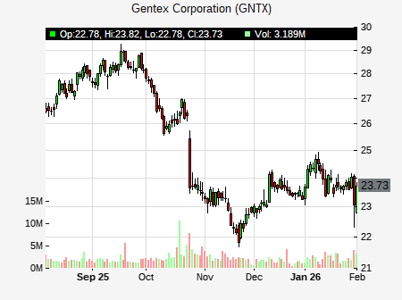 from UBS issued a price target of $25.00 for GNTX on 2026-02-02 13:50:09. The adjusted price target was set to $25.00. At the time of the announcement, GNTX was trading at $23.38. The overall price target consensus is at $27.33 with high price of $29.00, low price of $26.00, and median price is at $27.00. GNTX currently trades -24.25% versus its 52 week high of $30.79, and 20.30% compared to its 52 week low price of $20.30. Current 50 day moving average is $25.32, and the 200 day moving average is $24.16.