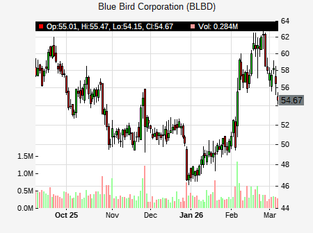 from Needham issued a price target of $78.00 for BLBD on 2026-02-05 13:47:38. The adjusted price target was set to $78.00. At the time of the announcement, BLBD was trading at $53.5999. The overall price target consensus is at $67.00 with high price of $76.00, low price of $55.00, and median price is at $70.00. BLBD currently trades -13.80% versus its 52 week high of $61.95, and 30.04% compared to its 52 week low price of $30.04. Current 50 day moving average is $52.28, and the 200 day moving average is $46.49.