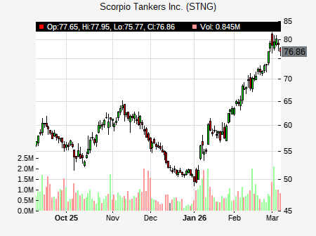 Jonathan Chappell from Evercore ISI issued a price target of $83.00 for STNG on 2026-02-13 19:09:00. The adjusted price target was set to $83.00. At the time of the announcement, STNG was trading at $70.51. The overall price target consensus is at $81.00 with high price of $83.00, low price of $80.00, and median price is at $80.00. STNG currently trades 8.02% versus its 52 week high of $65.07, and 31.26% compared to its 52 week low price of $31.26. Current 50 day moving average is $58.71, and the 200 day moving average is $46.00.