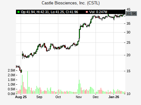 from Canaccord Genuity issued a price target of $50.00 for CSTL on 2025-12-22 11:54:26. The adjusted price target was set to $50.00. At the time of the announcement, CSTL was trading at $39.44. The overall price target consensus is at $50.00 with high price of $50.00, low price of $50.00, and median price is at $50.00. CSTL currently trades -1.99% versus its 52 week high of $40.23, and 14.75% compared to its 52 week low price of $14.75. Current 50 day moving average is $27.04, and the 200 day moving average is $21.67.