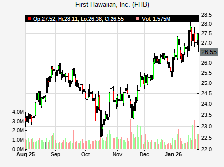 from Barclays issued a price target of $28.00 for FHB on 2025-11-11 09:55:21. The adjusted price target was set to $28.00. At the time of the announcement, FHB was trading at $24.83. The overall price target consensus is at $27.00 with high price of $28.00, low price of $26.00, and median price is at $27.00. FHB currently trades -11.07% versus its 52 week high of $27.92, and 20.43% compared to its 52 week low price of $20.43. Current 50 day moving average is $24.80, and the 200 day moving average is $24.45.