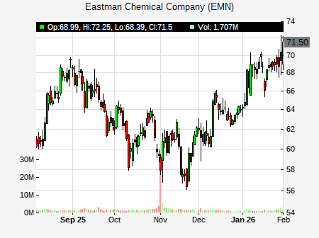 from KeyBanc issued a price target of $74.00 for EMN on 2026-01-09 11:54:46. The adjusted price target was set to $74.00. At the time of the announcement, EMN was trading at $68.78. The overall price target consensus is at $74.00 with high price of $79.00, low price of $70.00, and median price is at $75.00. EMN currently trades -33.25% versus its 52 week high of $103.21, and 56.93% compared to its 52 week low price of $56.93. Current 50 day moving average is $61.47, and the 200 day moving average is $73.81.