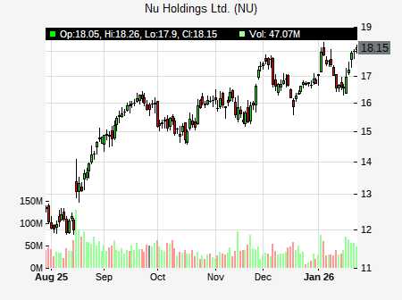 from Banco Santander issued a price target of $22.00 for NU on 2025-12-04 02:23:27. The adjusted price target was set to $22.00. At the time of the announcement, NU was trading at $17.44. The overall price target consensus is at $17.00 with high price of $19.00, low price of $16.00, and median price is at $16.50. NU currently trades 0.43% versus its 52 week high of $17.38, and 9.14% compared to its 52 week low price of $9.14. Current 50 day moving average is $15.73, and the 200 day moving average is $13.28.