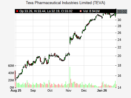 from Scotiabank issued a price target of $40.00 for TEVA on 2026-01-29 15:18:14. The adjusted price target was set to $40.00. At the time of the announcement, TEVA was trading at $32.895. The overall price target consensus is at $36.83 with high price of $40.00, low price of $35.00, and median price is at $35.50. TEVA currently trades 24.94% versus its 52 week high of $26.38, and 13.00% compared to its 52 week low price of $13.00. Current 50 day moving average is $21.27, and the 200 day moving average is $17.76.
