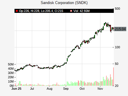 from Morgan Stanley issued a price target of $273.00 for SNDK on 2025-11-24 12:35:51. The adjusted price target was set to $273.00. At the time of the announcement, SNDK was trading at $200.27. The overall price target consensus is at $178.50 with high price of $300.00, low price of $55.00, and median price is at $217.50. SNDK currently trades -29.67% versus its 52 week high of $284.76, and 29.22% compared to its 52 week low price of $29.22. Current 50 day moving average is $163.51, and the 200 day moving average is $74.85.