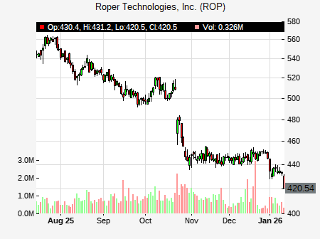 from Mizuho Securities issued a price target of $419.00 for ROP on 2026-01-05 10:47:18. The adjusted price target was set to $419.00. At the time of the announcement, ROP was trading at $434.54. The overall price target consensus is at $571.10 with high price of $650.00, low price of $475.00, and median price is at $572.50. ROP currently trades -26.56% versus its 52 week high of $592.46, and 439.08% compared to its 52 week low price of $439.08. Current 50 day moving average is $477.64, and the 200 day moving average is $536.78.