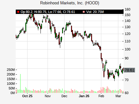 Craig Siegenthaler from New Street issued a price target of $122.00 for HOOD on 2026-03-05 16:46:00. The adjusted price target was set to $122.00. At the time of the announcement, HOOD was trading at $79.795. The overall price target consensus is at $132.80 with high price of $170.00, low price of $100.00, and median price is at $135.00. HOOD currently trades -48.16% versus its 52 week high of $153.86, and 30.67% compared to its 52 week low price of $30.67. Current 50 day moving average is $132.29, and the 200 day moving average is $88.02.