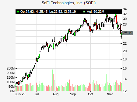 from Barclays issued a price target of $23.00 for SOFI on 2025-10-29 09:38:10. The adjusted price target was set to $23.00. At the time of the announcement, SOFI was trading at $31.66. The overall price target consensus is at $28.40 with high price of $35.00, low price of $18.00, and median price is at $29.00. SOFI currently trades -1.00% versus its 52 week high of $31.98, and 8.74% compared to its 52 week low price of $8.74. Current 50 day moving average is $26.86, and the 200 day moving average is $18.33.