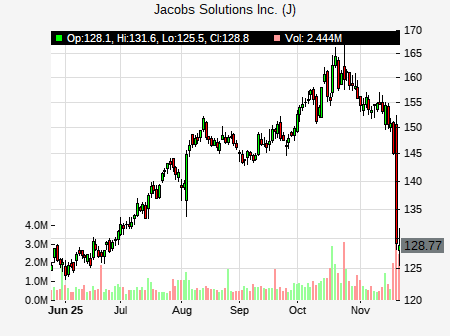 from Robert W. Baird issued a price target of $146.00 for J on 2025-11-21 09:54:50. The adjusted price target was set to $146.00. At the time of the announcement, J was trading at $129.17. The overall price target consensus is at $162.80 with high price of $170.00, low price of $160.00, and median price is at $161.00. J currently trades -23.31% versus its 52 week high of $168.44, and 107.64% compared to its 52 week low price of $107.64. Current 50 day moving average is $153.17, and the 200 day moving average is $135.61.