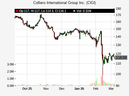 Erin Kyle from CIBC issued a price target of $173.00 for CIGI on 2026-02-17 15:31:05. The adjusted price target was set to $173.00. At the time of the announcement, CIGI was trading at $110.445. The overall price target consensus is at $186.00 with high price of $200.00, low price of $179.00, and median price is at $182.50. CIGI currently trades -35.53% versus its 52 week high of $171.51, and 105.05% compared to its 52 week low price of $105.05. Current 50 day moving average is $154.51, and the 200 day moving average is $138.86.
