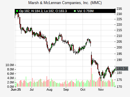 from RBC Capital issued a price target of $200.00 for MMC on 2025-11-24 21:44:01. The adjusted price target was set to $200.00. At the time of the announcement, MMC was trading at $179.28. The overall price target consensus is at $219.75 with high price of $257.00, low price of $195.00, and median price is at $209.00. MMC currently trades -27.00% versus its 52 week high of $245.83, and 175.95% compared to its 52 week low price of $175.95. Current 50 day moving average is $190.70, and the 200 day moving average is $212.22.