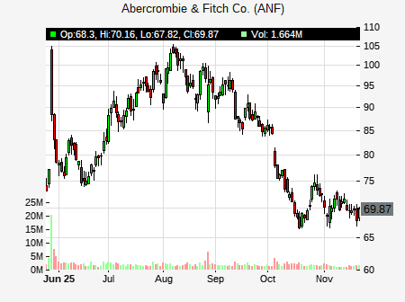 from Jefferies issued a price target of $100.00 for ANF on 2025-11-14 10:24:50. The adjusted price target was set to $100.00. At the time of the announcement, ANF was trading at $71.62. The overall price target consensus is at $100.50 with high price of $120.00, low price of $84.00, and median price is at $99.00. ANF currently trades -56.54% versus its 52 week high of $164.80, and 66.01% compared to its 52 week low price of $66.01. Current 50 day moving average is $78.97, and the 200 day moving average is $85.08.