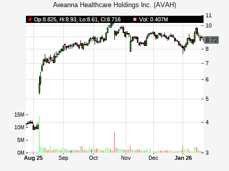 from RBC Capital issued a price target of $11.00 for AVAH on 2026-01-15 13:31:37. The adjusted price target was set to $11.00. At the time of the announcement, AVAH was trading at $9.39. The overall price target consensus is at $10.80 with high price of $13.00, low price of $9.00, and median price is at $10.00. AVAH currently trades -8.96% versus its 52 week high of $10.32, and 3.67% compared to its 52 week low price of $3.67. Current 50 day moving average is $9.14, and the 200 day moving average is $6.67.
