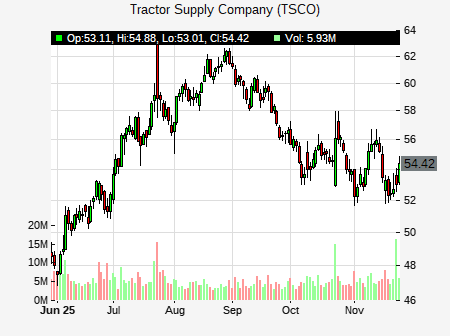 from Wells Fargo issued a price target of $65.00 for TSCO on 2025-10-23 17:42:48. The adjusted price target was set to $65.00. At the time of the announcement, TSCO was trading at $56.32. The overall price target consensus is at $64.00 with high price of $70.00, low price of $55.00, and median price is at $65.50. TSCO currently trades -11.48% versus its 52 week high of $63.75, and 46.87% compared to its 52 week low price of $46.87. Current 50 day moving average is $58.28, and the 200 day moving average is $54.73.