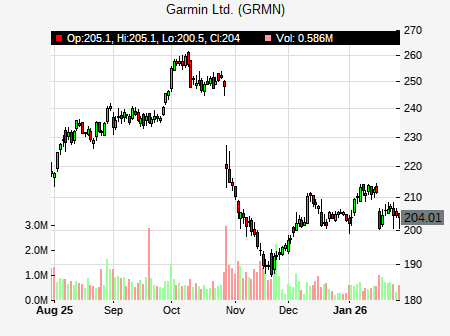 from Tigress Financial issued a price target of $310.00 for GRMN on 2025-12-19 15:11:22. The adjusted price target was set to $310.00. At the time of the announcement, GRMN was trading at $202.745. The overall price target consensus is at $235.33 with high price of $305.00, low price of $193.00, and median price is at $208.00. GRMN currently trades -22.50% versus its 52 week high of $261.69, and 168.63% compared to its 52 week low price of $168.63. Current 50 day moving average is $228.54, and the 200 day moving average is $216.52.