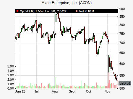 from RBC Capital issued a price target of $860.00 for AXON on 2025-11-17 09:43:07. The adjusted price target was set to $860.00. At the time of the announcement, AXON was trading at $554.37. The overall price target consensus is at $843.29 with high price of $900.00, low price of $753.00, and median price is at $855.00. AXON currently trades -37.42% versus its 52 week high of $885.92, and 471.72% compared to its 52 week low price of $471.72. Current 50 day moving average is $702.88, and the 200 day moving average is $685.08.
