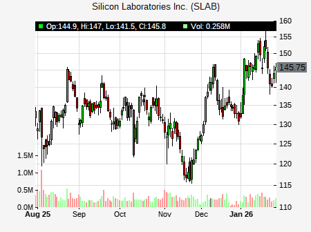 Tore Svanberg from Stifel Nicolaus issued a price target of $165.00 for SLAB on 2025-10-06 19:54:02. The adjusted price target was set to $165.00. At the time of the announcement, SLAB was trading at $135.13. The overall price target consensus is at $130.00 with high price of $130.00, low price of $130.00, and median price is at $130.00. SLAB currently trades -15.16% versus its 52 week high of $160.00, and 86.65% compared to its 52 week low price of $86.65. Current 50 day moving average is $133.50, and the 200 day moving average is $129.74.
