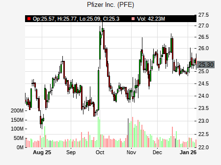 from UBS issued a price target of $25.00 for PFE on 2026-01-06 22:06:32. The adjusted price target was set to $25.00. At the time of the announcement, PFE was trading at $25.43. The overall price target consensus is at $28.57 with high price of $35.00, low price of $24.00, and median price is at $28.00. PFE currently trades -6.43% versus its 52 week high of $27.21, and 20.01% compared to its 52 week low price of $20.01. Current 50 day moving average is $24.62, and the 200 day moving average is $23.81.