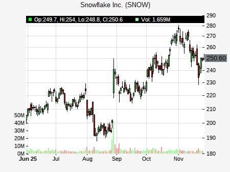 from Jefferies issued a price target of $300.00 for SNOW on 2025-11-24 08:57:00. The adjusted price target was set to $300.00. At the time of the announcement, SNOW was trading at $234.03. The overall price target consensus is at $274.15 with high price of $325.00, low price of $221.00, and median price is at $276.00. SNOW currently trades -16.62% versus its 52 week high of $280.67, and 120.70% compared to its 52 week low price of $120.70. Current 50 day moving average is $246.27, and the 200 day moving average is $203.07.