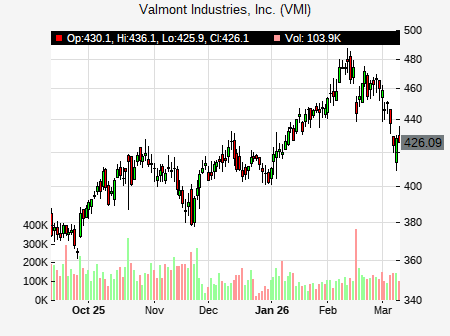 Brent Thielman from D.A. Davidson issued a price target of $450.00 for VMI on 2026-02-18 12:50:25. The adjusted price target was set to $450.00. At the time of the announcement, VMI was trading at $443.96. The overall price target consensus is at $453.50 with high price of $492.00, low price of $415.00, and median price is at $453.50. VMI currently trades 4.05% versus its 52 week high of $427.81, and 253.88% compared to its 52 week low price of $253.88. Current 50 day moving average is $398.87, and the 200 day moving average is $347.32.