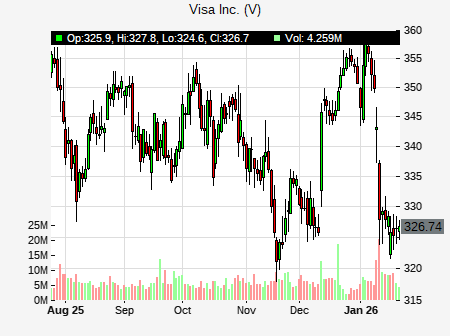 from Truist Financial issued a price target of $374.00 for V on 2026-01-20 14:47:17. The adjusted price target was set to $374.00. At the time of the announcement, V was trading at $326.43. The overall price target consensus is at $401.78 with high price of $425.00, low price of $374.00, and median price is at $405.00. V currently trades -12.82% versus its 52 week high of $374.11, and 300.45% compared to its 52 week low price of $300.45. Current 50 day moving average is $339.44, and the 200 day moving average is $344.45.